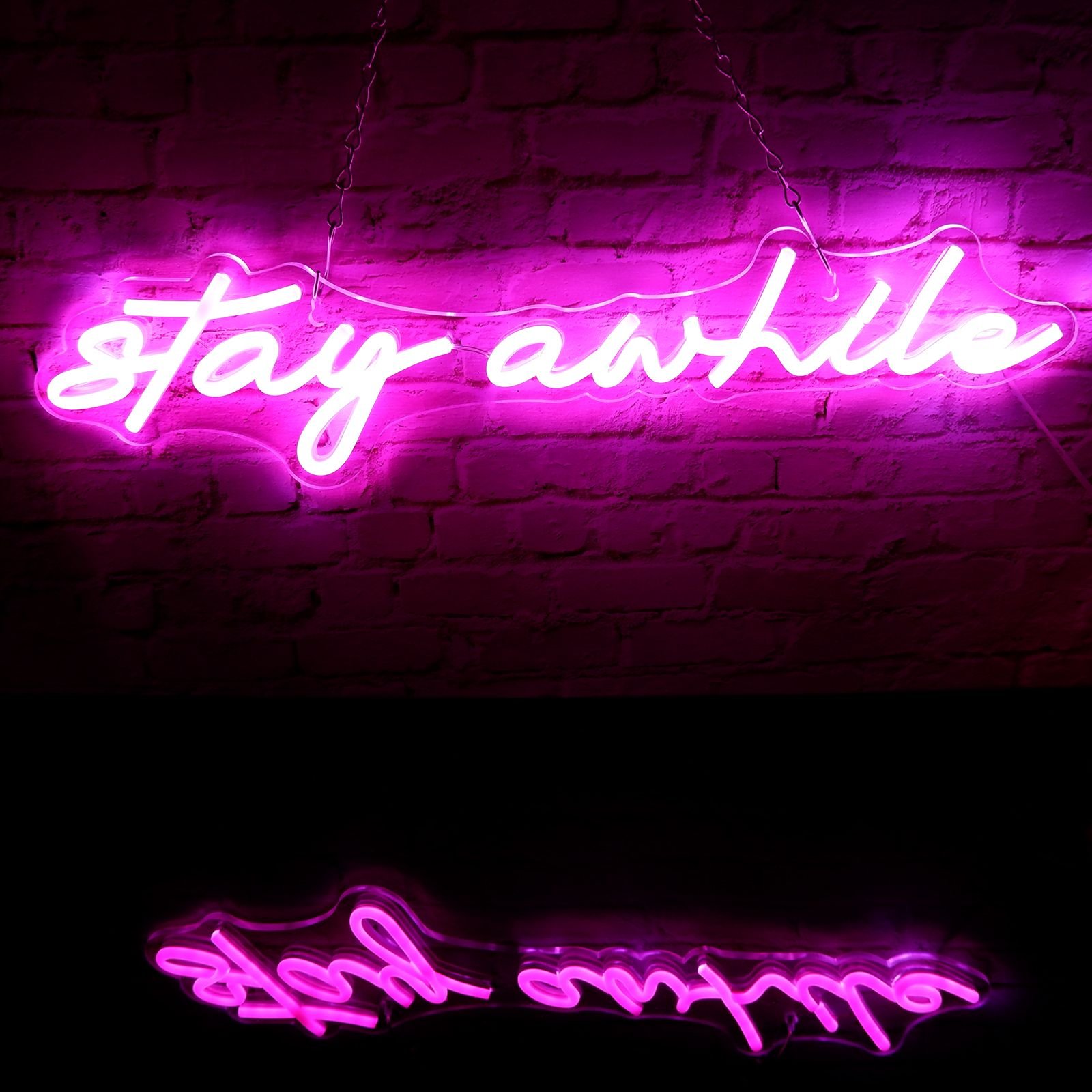 Bright Home Bar Sign: "Stay Awhile", great color. Neon lights are all the rage! pink room decor is the perfect size(19.7x5 inch) for above the bed, it's also great for a kid's room or bar in your house. You can got this for your front entryway hallway as a fun home decor piece. Turned your living room into a trendy bar! Having your own unique cool neon signs for bedroom has never been so signsasy! The stay awhile neon light is eye-catching, especially in the dark.